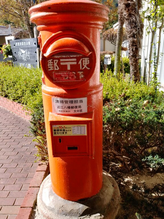 写真の赤い丸ポストは久しぶりに見ました。紅葉の後ろには「沖の島」です
